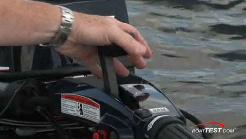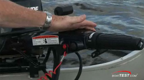 Turumuz motorun en çok kullanılan kısmı ile başlıyor. Çok yönlü bir manuel direksiyon. İlk olarak, ayarlanabilir bir yükseklik ayarı var. Setin altındaki basit başparmak vidası, yüksekliği artırıp azaltabilir. Bu özellik kolun uyuşmasını engellemek için uzun bir gelişim süreci gösterdi. Motor çalıştırma ve durdurma tuşları size doğru bakıyor (sol elinizle sürdüğünüz varsayılarak). Acil durdurma kordonu, çalıştırma ve durdurma düğmelerinin hemen yanında. Direksiyonun sonunda bir trim düğmesi var. Baş parmağınızı hafifçe bastığınızda hızınıza bağlı olarak düşerek anında kullanılabilmesi elverişli olur. Hız düşürüldüğünde, aynı zamanda trimi de indirin ve elinizi tekrar konumlandırmanıza gerek kalmadan manevralarınız sayesinde havalandırma işlemini de yapmış olursunuz.